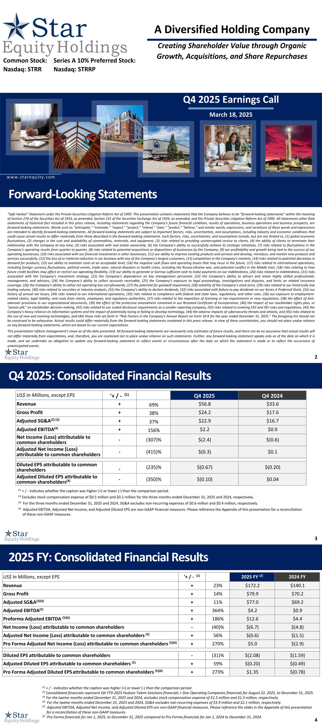 1 A Diversified Holding Company www.starequity .com Creating Shareholder Value through Organic Growth, Acquisitions, and Share Repurchases Q4 2025 Earnings Call March 18, 2025 Common Stock: Nasdaq: STRR Series A 10% Preferred Stock: Nasdaq: STRRP 2 “Safe Harbor” Statement under the Private Securities Litigation Reform Act of 1995: This presentation contains statements that the Company believes to be “forward-looking statements” within the meaning of Section 27A of the Securities Act of 1933, as amended, Section 21E of the Securities Exchange Act of 1934, as amended, and the Private Securities Litigation Reform Act of 1995. All statements other than statements of historical fact included in this press release, including statements regarding the Company’s future financial condition, results of operations, business operations and business prospects, are forward-looking statements. Words such as “anticipate,” “estimate,” “expect,” “project,” “intend,” “plan,” “predict,” “believe,” and similar words, expressions, and variations of these words and expressions are intended to identify forward-looking statements. All forward-looking statements are subject to important factors, risks, uncertainties, and assumptions, including industry and economic conditions that could cause actual results to differ materially from those described in the forward-looking statements. Such factors, risks, uncertainties, and assumptions include, but are not limited to, (1) global economic fluctuations, (2) changes in the cost and availability of commodities, materials, and equipment, (3) risks related to providing uninterrupted service to clients, (4) the ability of clients to terminate their relationship with the Company at any time, (5) risks associated with real estate ownership, (6) the Company’s ability to successfully achieve its strategic initiatives, (7) risks related to fluctuations in the Company’s operating results from quarter to quarter, (8) risks related to potential acquisitions or dispositions of businesses by the Company, (9) our profitability and growth being tied to the success of our operating businesses, (10) risks associated with our financial investments in other businesses, (11) our ability to improve existing products and services and develop, introduce, and market new products and services successfully, (12) the loss of or material reduction in our business with any of the Company’s largest customers, (13) competition in the Company’s markets, (14) risks related to potential decreases in demand for products, (15) our ability to maintain costs at an acceptable level, (16) the negative cash flows and operating losses that may recur in the future, (17) risks related to international operations, including foreign currency fluctuations, political events, trade wars, natural disasters or health crises, including the Russia-Ukraine war, and potential conflict in the Middle East, (18) risks relating to how future credit facilities may affect or restrict our operating flexibility, (19) our ability to generate or borrow sufficient cash to make payments on our indebtedness, (20) risks related to indebtedness, (21) risks associated with the Company’s investment strategy, (22) the Company’s dependence on key management personnel, (23) the Company’s ability to attract and retain highly skilled professionals, management, and advisors, (24) the Company’s ability to collect accounts receivable, (25) the Company’s exposure to legal proceedings, investigations and disputes, and limits on related insurance coverage, (26) the Company’s ability to utilize net operating loss carryforwards, (27) the potential for goodwill impairment, (28) volatility of the Company’s stock price, (29) risks related to our historically low trading volume, (30) risks related to securities or industry analysts, (31) the Company’s ability to declare dividends, (32) risks associated with failure to pay dividends on our Series A Preferred Stock, (33) our history of annual net losses, (34) risks related to our international operations, (35) risks related to compliance with federal and state laws, regulations, and other rules, (36) our exposure to employment- related claims, legal liability, and costs from clients, employees, and regulatory authorities, (37) risks related to the imposition of licensing or tax requirements or new regulations, (38) the effect of Anti- takeover provisions in our organizational documents, (39) the effect of the protective amendment contained in our Restated Certificate of Incorporation, (40) the impact of our stockholder rights plan, or “poison pill,” on stockholder decision making, (41) risks related to our scaled disclosure requirements as a smaller reporting company, (42) risks related to evolving ESG and DEI rules and regulations, (43) the Company’s heavy reliance on information systems and the impact of potentially losing or failing to develop technology, (44) the adverse impacts of cybersecurity threats and attacks, and (45) risks related to the use of new and evolving technologies, and (46) those risks set forth in “Risk Factors in the Company’s Annual Report on Form 10-K for the year ended December 31, 2025.” The foregoing list should not be construed to be exhaustive. Actual results could differ materially from the forward-looking statements contained in this press release. In view of these uncertainties, you should not place undue reliance on any forward-looking statements, which are based on our current expectations. This presentation reflects management’s views as of the date presented. All forward-looking statements are necessarily only estimates of future results, and there can be no assurance that actual results will not differ materially from expectations, and, therefore, you are cautioned not to place undue reliance on such statements. Further, any forward-looking statement speaks only as of the date on which it is 