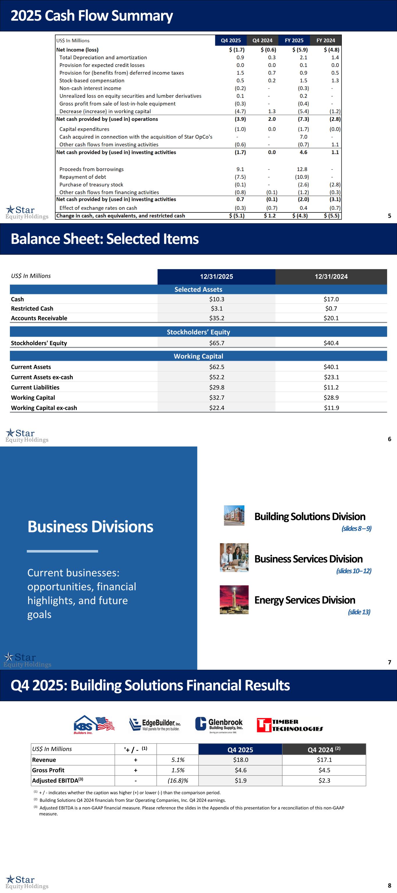 5 2025 Cash Flow Summary 6 Balance Sheet: Selected Items US$ In Millions 12/31/2025 12/31/2024 Selected Assets Cash $10.3 $17.0 Restricted Cash $3.1 $0.7 Accounts Receivable $35.2 $20.1 Stockholders’ Equity Stockholders' Equity $65.7 $40.4 Working Capital Current Assets $62.5 $40.1 Current Assets ex-cash $52.2 $23.1 Current Liabilities $29.8 $11.2 Working Capital $32.7 $28.9 Working Capital ex-cash $22.4 $11.9 7 Business Services Division (slides 10– 12) Energy Services Division (slide 13) Business Divisions Current businesses: opportunities, financial highlights, and future goals Building Solutions Division (slides 8 – 9) 8 Q4 2025: Building Solutions Financial Results US$ In Millions '+ / - (1) Q4 2025 Q4 2024 (2) Revenue + 5.1% $18.0 $17.1 Gross Profit + 1.5% $4.6 $4.5 Adjusted EBITDA(3) - (16.8)% $1.9 $2.3 (1) + / - indicates whether the caption was higher (+) or lower (-) than the comparison period. (2) Building Solutions Q4 2024 financials from Star Operating Companies, Inc. Q4 2024 earnings. (3) Adjusted EBITDA is a non-GAAP financial measure. Please reference the slides in the Appendix of this presentation for a reconciliation of this non-GAAP measure.