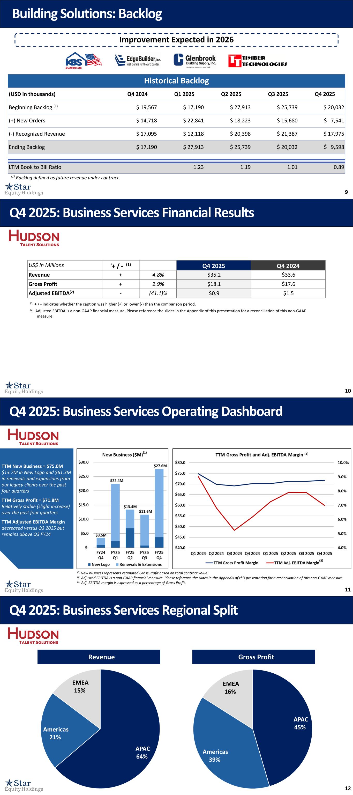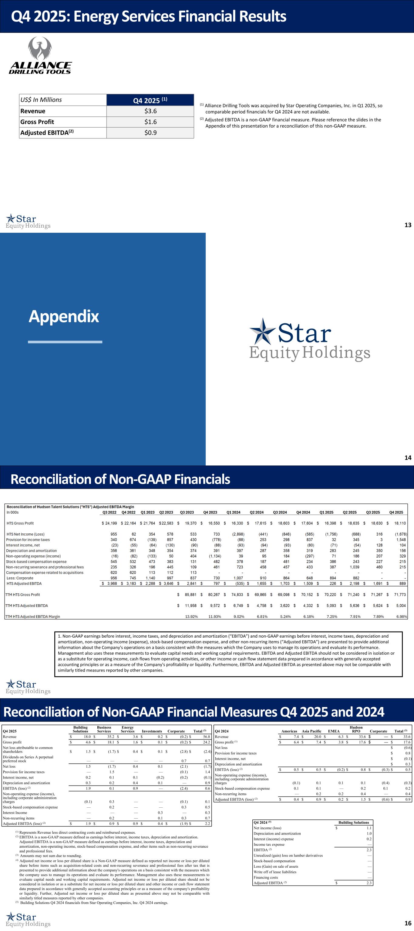 13 Q4 2025: Energy Services Financial Results US$ In Millions Q4 2025 (1) Revenue $3.6 Gross Profit $1.6 Adjusted EBITDA(2) $0.9 (1) Alliance Drilling Tools was acquired by Star Operating Companies, Inc. in Q1 2025, so comparable period financials for Q4 2024 are not available. (2) Adjusted EBITDA is a non-GAAP financial measure. Please reference the slides in the Appendix of this presentation for a reconciliation of this non-GAAP measure. 14 Appendix 1. Non-GAAP earnings before interest, income taxes, and depreciation and amortization (“EBITDA”) and non-GAAP earnings before interest, income taxes, depreciation and amortization, non-operating income (expense), stock-based compensation expense, and other non-recurring items (“Adjusted EBITDA”) are presented to provide additional information about the Company's operations on a basis consistent with the measures which the Company uses to manage its operations and evaluate its performance. Management also uses these measurements to evaluate capital needs and working capital requirements. EBITDA and Adjusted EBITDA should not be considered in isolation or as a substitute for operating income, cash flows from operating activities, or other income or cash flow statement data prepared in accordance with generally accepted accounting principles or as a measure of the Company's profitability or liquidity. Furthermore, EBITDA and Adjusted EBITDA as presented above may not be comparable with similarly titled measures reported by other companies. Reconciliation of Non-GAAP Financials 16 Q4 2025 Building Solutions Business Services Energy Services Investments Corporate Total (3) Revenue $ 18.0 $ 35.2 $ 3.6 $ 0.2 $ (0.2) $ 56.8 Gross profit $ 4.6 $ 18.1 $ 1.6 $ 0.1 $ (0.2) $ 24.2 Net loss attributable to common shareholders $ 1.5 $ (1.7) $ 0.4 $ 0.1 $ (2.8) $ (2.4) Dividends on Series A perpetual preferred stock — — — — 0.7 0.7 Net loss 1.5 (1.7) 0.4 0.1 (2.1) (1.7) Provision for income taxes — 1.5 — — (0.1) 1.4 Interest income, net 0.2 0.1 0.1 (0.2) (0.2) (0.1) Depreciation and amortization 0.3 0.2 0.4 0.1 — 0.9 EBITDA (loss) (2) 1.9 0.1 0.9 — (2.4) 0.6 Non-operating expense (income), including corporate administration charges (0.1) 0.3 — — (0.1) 0.1 Stock-based compensation expense — 0.2 — — 0.3 0.5 Interest Income — — — 0.3 — 0.3 Non-recurring items — 0.2 — 0.1 0.3 0.7 Adjusted EBITDA (loss) (2) $ 1.9 $ 0.9 $ 0.9 $ 0.4 $ (1.9) $ 2.2 Q4 2024 Americas Asia Pacific EMEA Hudson RPO Corporate Total (3) Revenue $ 7.4 $ 20.0 $ 6.3 $ 33.6 $ — $ 33.6 Gross profit (1) $ 6.4 $ 7.4 $ 3.8 $ 17.6 $ — $ 17.6 Net loss $ (0.6) Provision for income taxes $ 0.8 Interest income, net $ (0.1) Depreciation and amortization $ 0.3 EBITDA (loss) (2) $ 0.5 $ 0.5 $ (0.2) $ 0.8 $ (0.3) $ 0.5 Non-operating expense (income), including corporate administration charges (0.1) 0.1 0.1 0.1 (0.4) (0.3) Stock-based compensation expense 0.1 0.1 — 0.2 0.1 0.2 Non-recurring items — 0.2 0.2 0.4 — 0.4 Adjusted EBITDA (loss) (2) $ 0.4 $ 0.9 $ 0.2 $ 1.5 $ (0.6) $ 0.9 (1) Represents Revenue less direct contracting costs and reimbursed expenses. (2) EBITDA is a non-GAAP measure defined as earnings before interest, income taxes, depreciation and amortization. Adjusted EBITDA is a non-GAAP measure defined as earnings before interest, income taxes, depreciation and amortization, non-operating income, stock-based compensation expense, and other items such as non-recurring severance and professional fees. (3) Amounts may not sum due to rounding. (4) Adjusted net income or loss per diluted share is a Non-GAAP measure defined as reported net income or loss per diluted share before items such as acquisition-related costs and non-recurring severance and professional fees after tax that is presented to provide additional information about the company's operations on a basis consistent with the measures which the company uses to manage its operations and evaluate its performance. Management also uses these measurements to evaluate capital needs and working capital requirements. Adjusted net income or loss per diluted share should not be considered in isolation or as a substitute for net income or loss per diluted share and other income or cash flow statement data prepared in accordance with generally accepted accounting principles or as a measure of the company's profitability or liquidity. Further, Adjusted net income or loss per diluted share as presented above may not be comparable with similarly titled measures reported by other companies. (5) Building Solutions Q4 2024 financials from Star Operating Companies, Inc. Q4 2024 earnings. Reconciliation of Non-GAAP Financial Measures Q4 2025 and 2024 Q4 2024 (5) Building Solutions Net income (loss) $ 1.1 Depreciation and amortization 1.0 Interest (income) expense 0.2 Income tax expense — EBITDA (2) 2.3 Unrealized (gain) loss on lumber derivatives — Stock-based compensation — Loss (Gain) on sale of assets — Write off of lease liabilities — Financing costs — Adjusted EBITDA (2) $ 2.3
