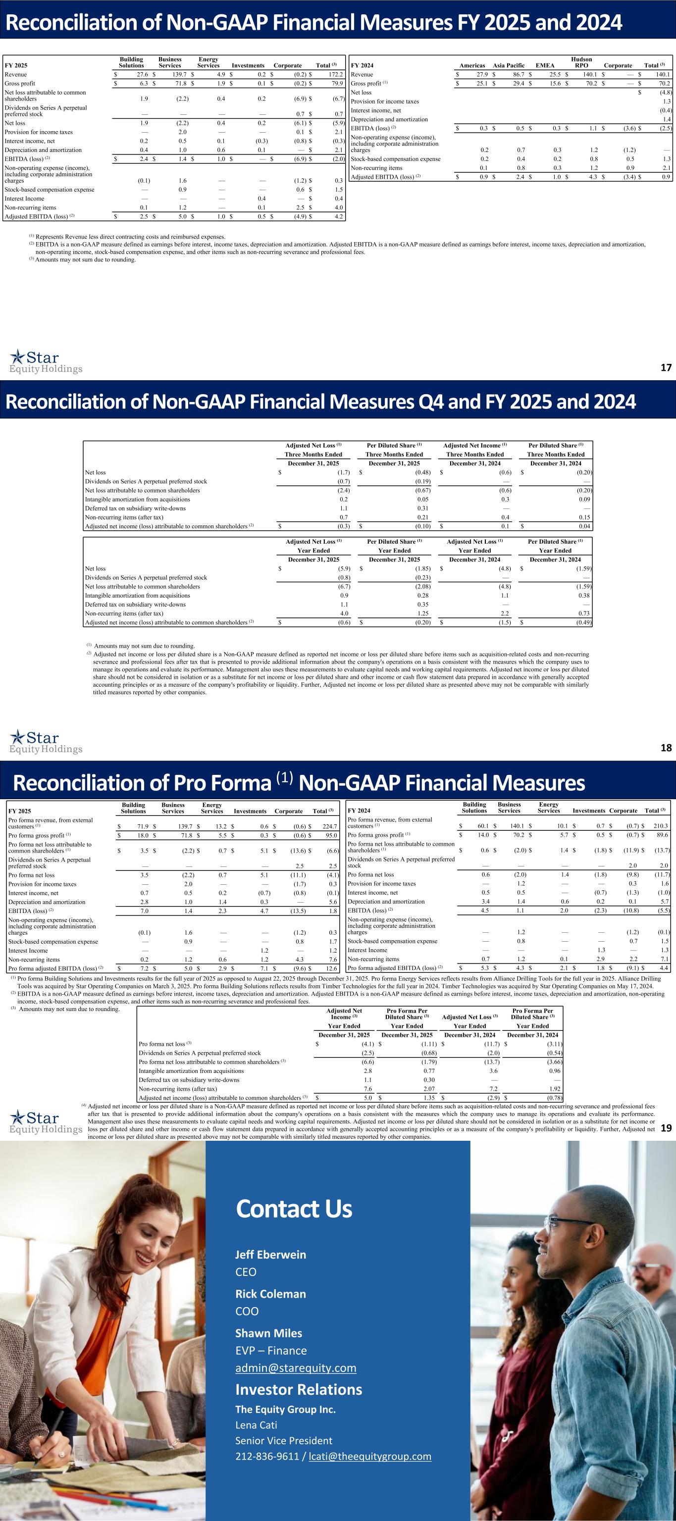 1.Pro forma Building Solutions, Energy Services, and Investments results from Star Operating Companies, Inc. for the full year of 2024. Pro forma Building Solutions reflects results from Timber Technologies for the full year in 2024. Timber Technologies was acquired by Star Operating Companies on May 17, 2024. Pro forma Energy Services in 2024 reflects Alliance Drilling Tools results, which was acquired by Star Operating Companies on March 3, 2025.